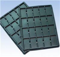 (吸塑托盤)吸塑商品的原材料就只有塑膠片材,膠片薄厚平常不大于1.5MM,較常用的材料有:PVC、PET、PP、PS及其在這個基礎上的植絨材料、燙金材料和防靜電材料。